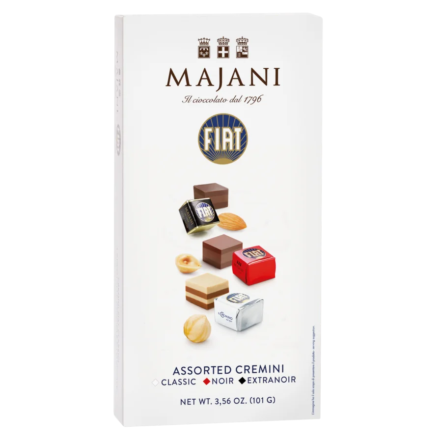 Die MAJANI »FIAT-Cremini-Mix« 101 g ist ein ikonischer Klassiker der italienischen Confiseriekunst. Seit 1911 fertigt Majani 1796 in Bologna diese besonderen dreischichtigen Pralinen, ursprünglich als Genussbegleiter zur Markteinführung des legendären Fiat Tipo 4.