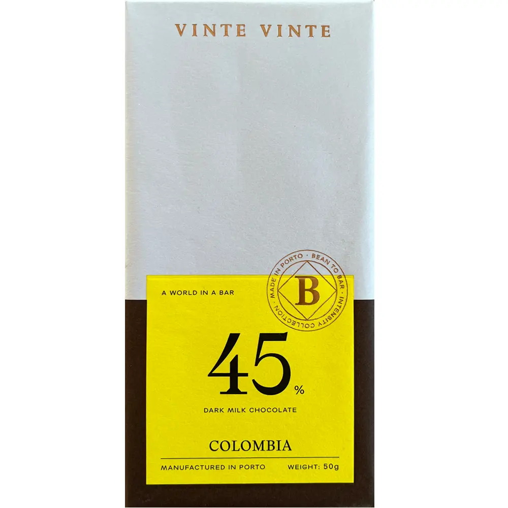 Die VINTE VINTE »45%« Milchschokolade wird aus edlen Kakaobohnen aus den besten Anbaugebieten Kolumbiens hergestellt.